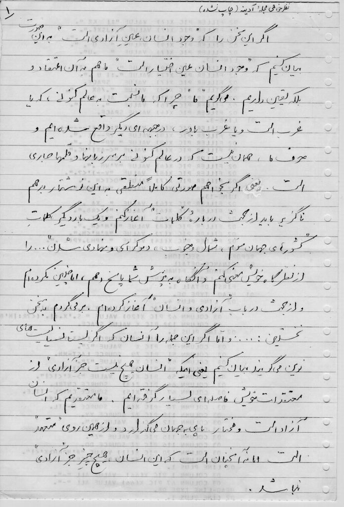 اگر این سخن را که «وجود انسان ، عین آزادی است» به این صورت بیان کنیم که «وجود انسان عین اختیار است» ما هم به آن اعتقاد و بلکه یقین داریم. میگویم «ما» چرا که ما نسبت به عالم کنونی ، که یا غرب است و یا غرب باور ، در جبههای دیگر واقع شدهایم و حرف ما ، همان نیست که در عالم کنونی برسر زبانها و قلمها جاری است. یعنی اگر بخواهم صورتی کاملا منطقی به این نوشتار بدهم ناگزیر باید از بحث درباره «کلمات» آغاز کنم و یک بار دیگر ، کلمات کشورهای جهان سوم ، شمال و جنوب ، دموکراسی و نهادی شدن ... را از نظرگاه خویش معنی کنم و آنگاه به پرسش شما پاسخ دهم، اما چنین نکردهام و از بحث در باب «آزادی و انسان» آغاز کردهام. برمیگردم به سخن نخستین: .... و اما اگر این جمله را انسان که اگزیستانسیالیستهای نوین میگویند بیان کنیم یعنی اینکه «انسان هیچ نیست جز آزادی» از معتقدات خویش فاصلهای بسیار گرفتهایم. ما معتقدیم که انسان آزاد است و مختار پای به جهان می گذارد و از همین روی «متعهد» است اما نه آنچنان است که این انسان هیچ چیز جز «آزادی» نباشد.